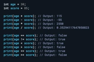 میتوانید از عملیات مختلف ریاضی مانند جمع، تفریق، ضرب و تقسیم روی متغیرهای int استفاده کنید. همچنین میتوانید از عملگرهای مقایسهای مانند ==، !=، <، >، <= و >= برای مقایسه دو متغیر int استفاده کنید.